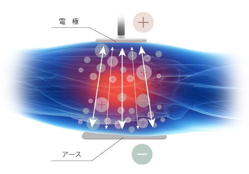 電極とアース(+極と-極)で体をはさみ、体内の分子を振動、分子同士の摩擦熱(ジュール熱)を発生させることで体を温めます。